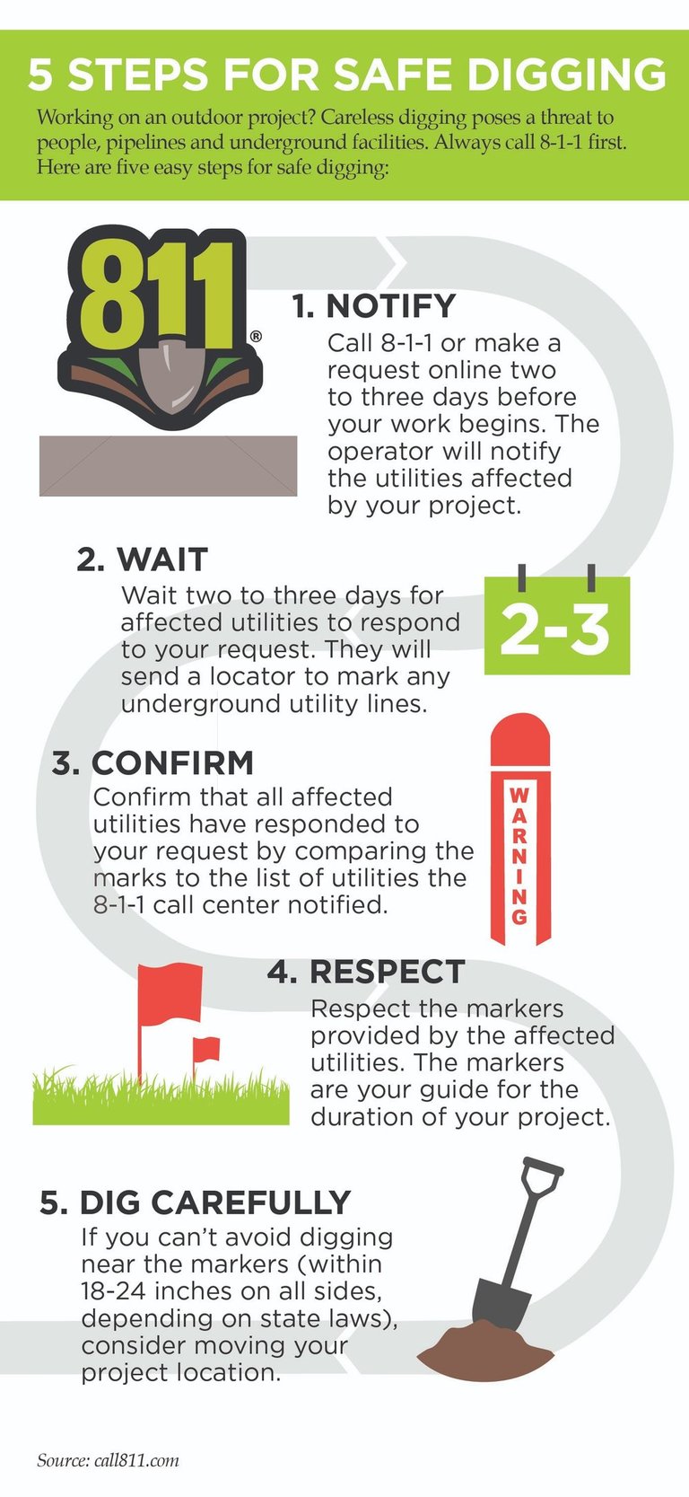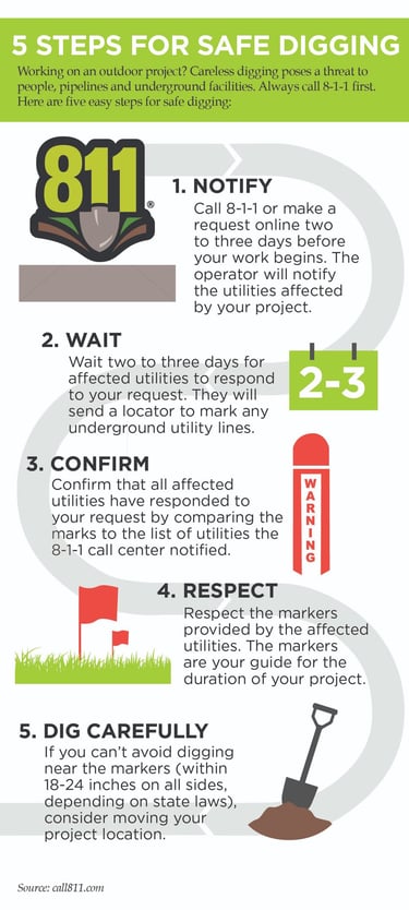 Please contact 811 at least 3 business days before our scheduled start date. This service is free, but it is a legal requirement before we can break ground..