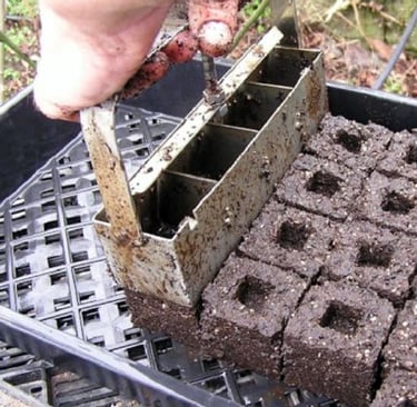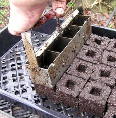 Soil Blocks: Reduce plastic waste, minimize transplant shock, and are easy to make using a soil blocker tool.